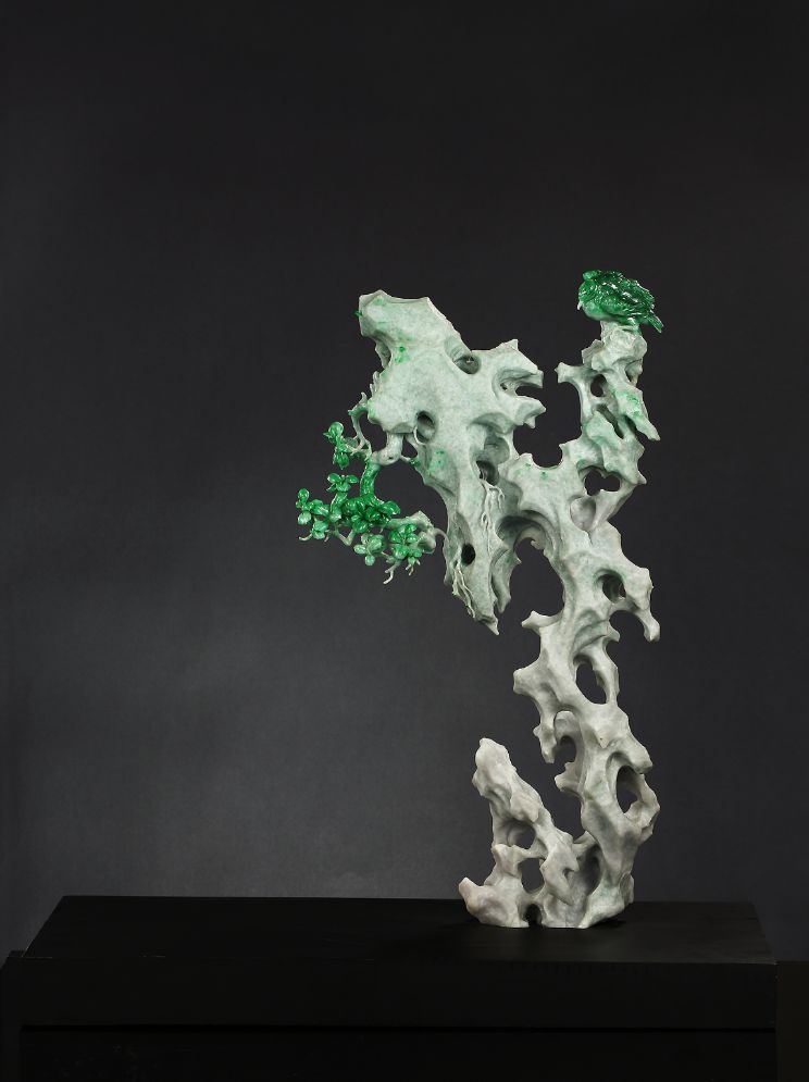以《一樹清風》為例看玉雕大師如何俏色巧用,作品原料為翡翠,顏色主要以不同色調(diào)的綠色為主,作品選材自然主題,巧用原料中的深綠色部分做樹木及臥鳥,其余部分做怪石狀。著重刻畫樹葉、根莖、羽毛、怪石走向等細節(jié),用顏色濃淡表現(xiàn)前后關系,凸顯立體感和真實感,以刻刀為筆,“繪制”出一副頗具國風的工筆畫。