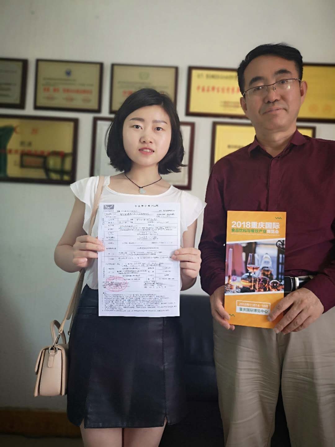 餐博會(huì)組委會(huì)工作人員楊珊(左)與重慶鵬通食品機(jī)械浦總(右)簽單合影