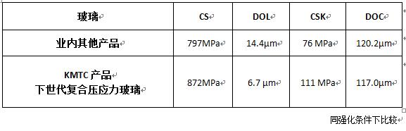 復合壓應力玻璃為新一代鋰鋁硅玻璃,可化學強化(CS)值在800MPa以上,深度(DOC)高于110µm。