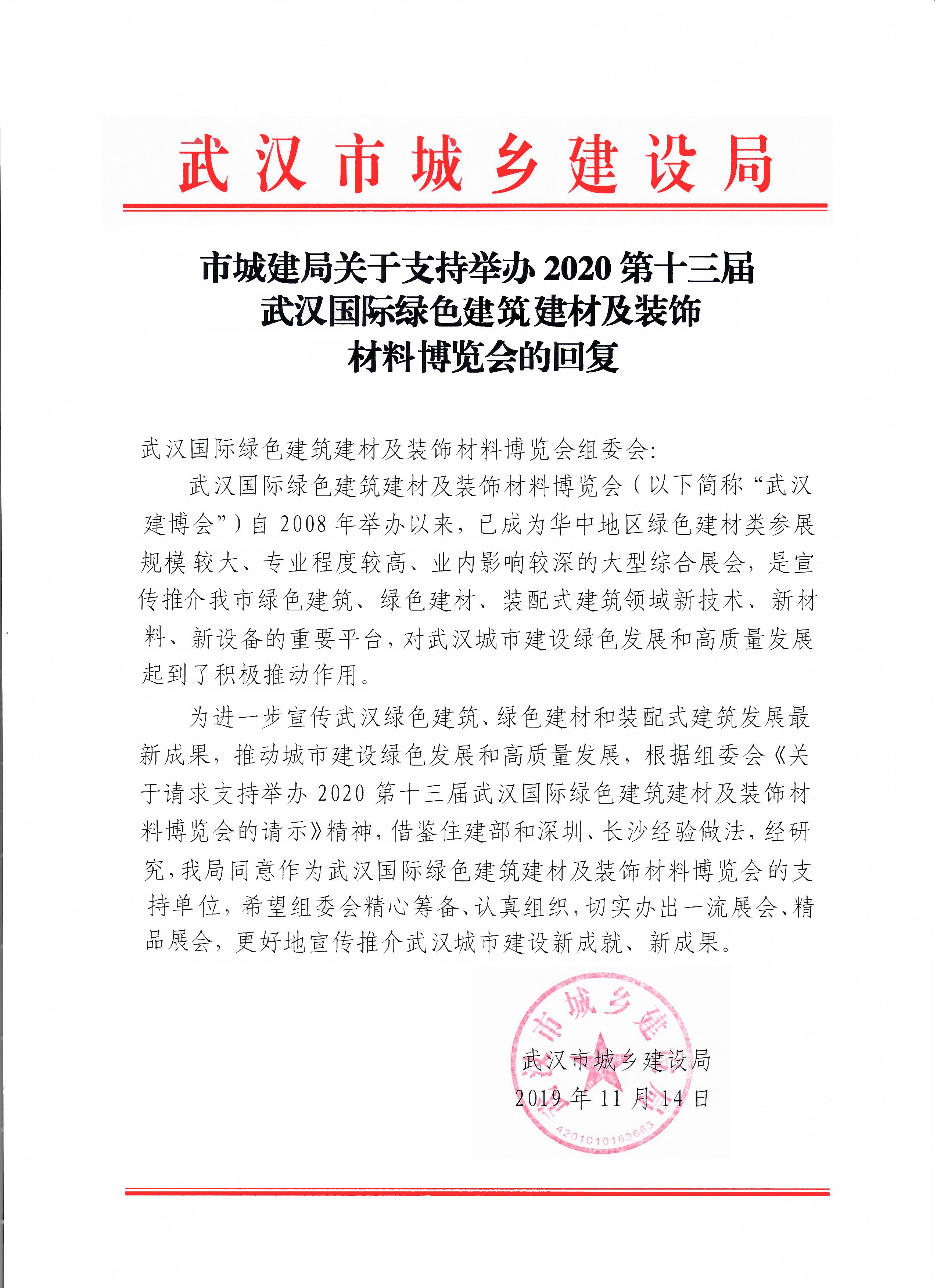日前,武漢市城建局做出決定,全力支持2020第十三屆武漢國際綠色建筑建材及裝飾材料博覽會(簡稱:武漢建博會)做大做強,并下文回復,強調(diào)要切實辦出一流展會、精品展會,更好宣傳推介武漢城市建設新成就、新成果。