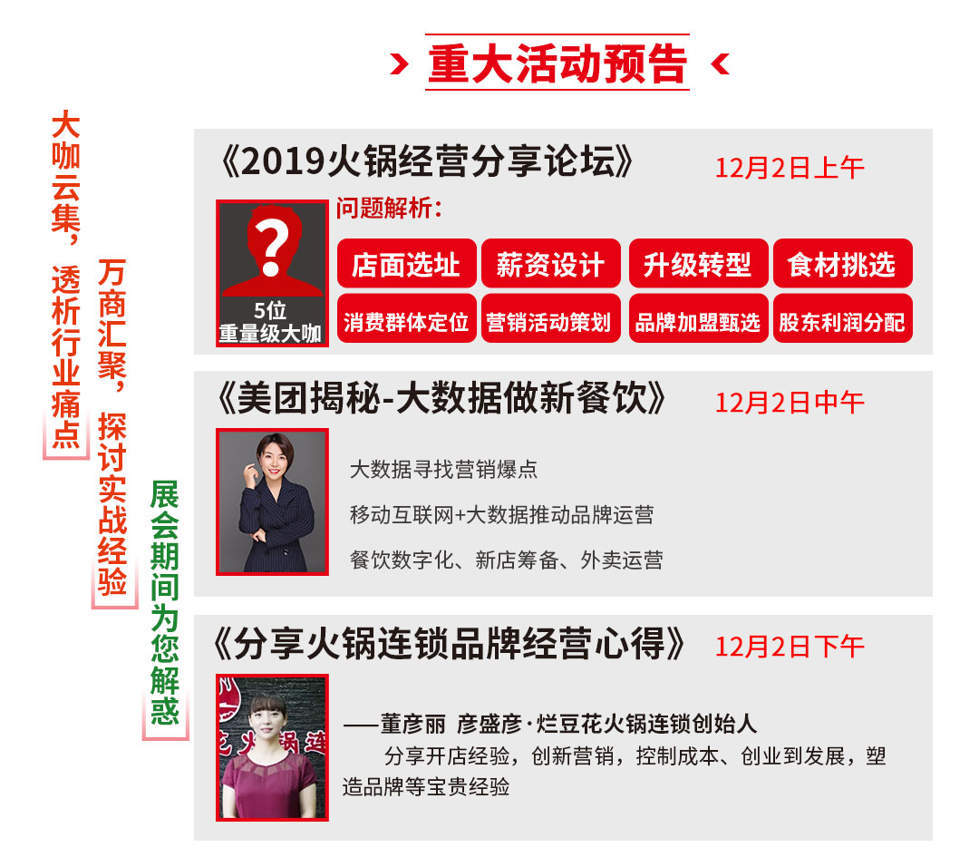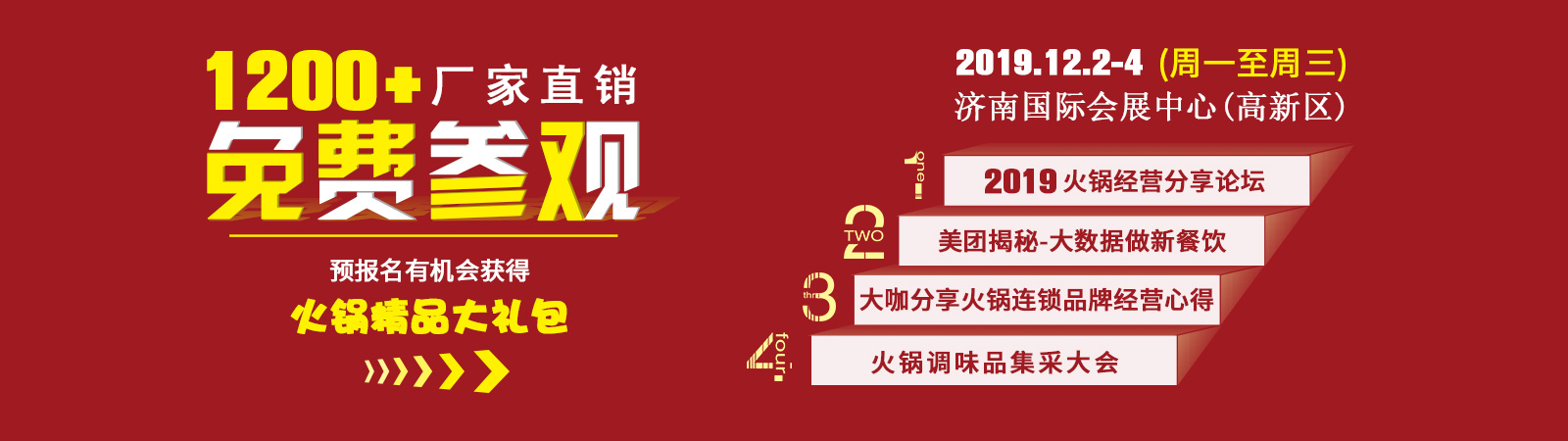2019全國(guó)最大規(guī)模冬季火鍋盛會(huì)即將開幕,火鍋、調(diào)味品等餐飲全產(chǎn)業(yè)鏈1200 家廠家直銷,90000種新品、爆品、暢銷品。